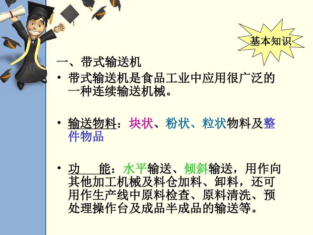 輸送物料:塊狀、粉狀、粒狀物料及整 件物品 功能:水平輸送、傾斜輸送,用作向 其他加工機械及料倉加料、卸料,還可 用作生產線中原料檢查、原料清洗、預 處理操作臺及成品半成品的輸送等。