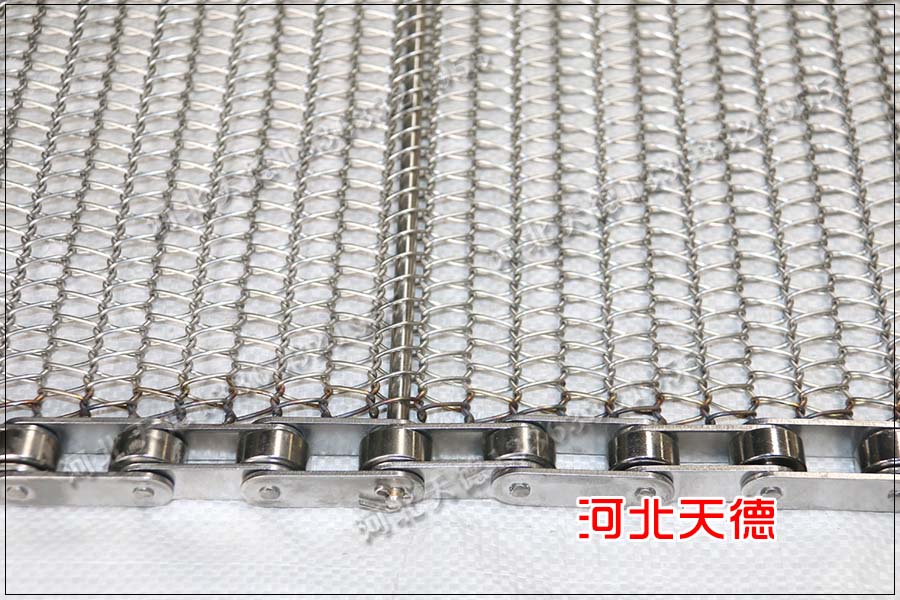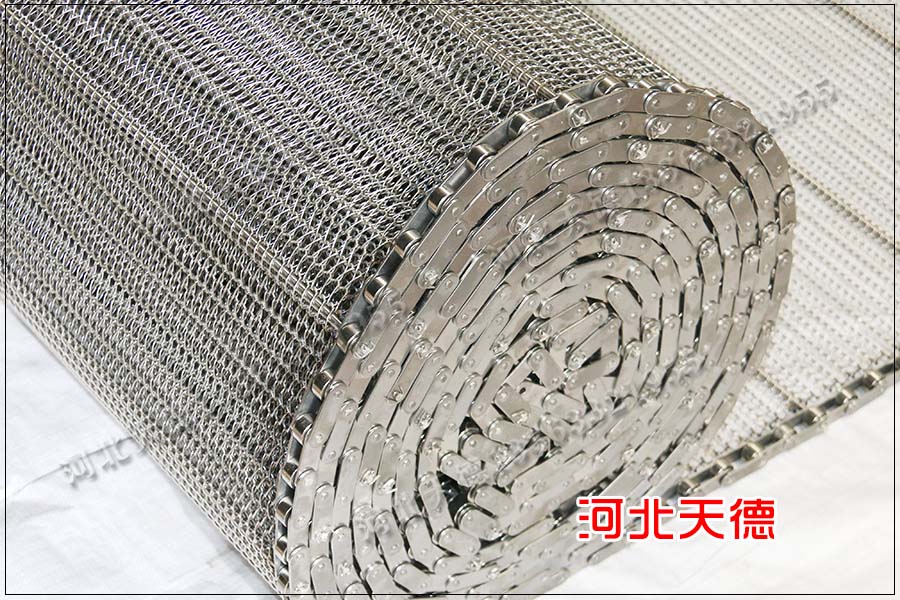 不銹鋼網帶總寬度為600毫米,總長度為11米,絲徑為1.2毫米,螺距為10毫米,節距為15毫米,鏈條節距為31.75毫米,桿直徑為6毫米,4節一根不銹鋼桿,在食品行業中我們采用不銹鋼304材質,這樣才能保證食品的味道鮮美。