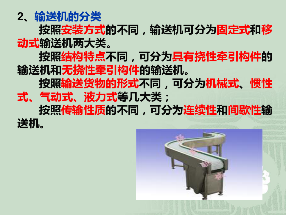輸送機(jī)的分類(lèi) 按照安裝方式的不同,輸送機(jī)可分為固定式和移動(dòng)式輸送機(jī)兩大類(lèi)。 按照結(jié)構(gòu)特點(diǎn)不同,可分為具有撓性牽引構(gòu)件的輸送機(jī)和無(wú)撓性牽引構(gòu)件的輸送機(jī) 按照輸送貨物的形式不同,可分為機(jī)械式、慣性式、氣動(dòng)式、液力式等幾大類(lèi); 按照傳輸性質(zhì)的不同,可分為連續(xù)性和間歇性輸送機(jī)。