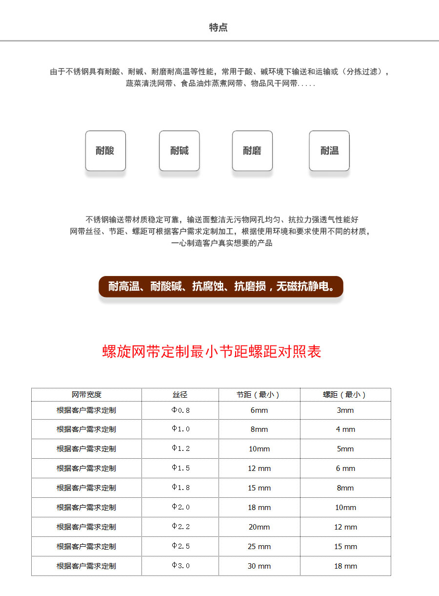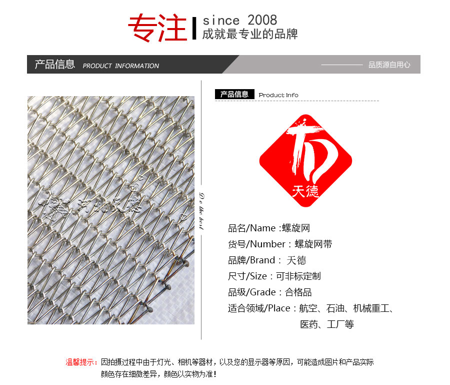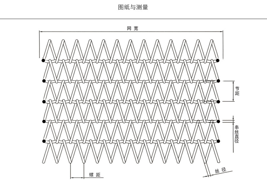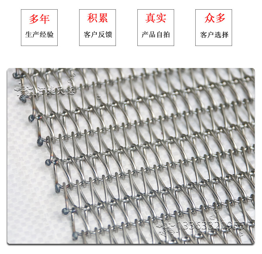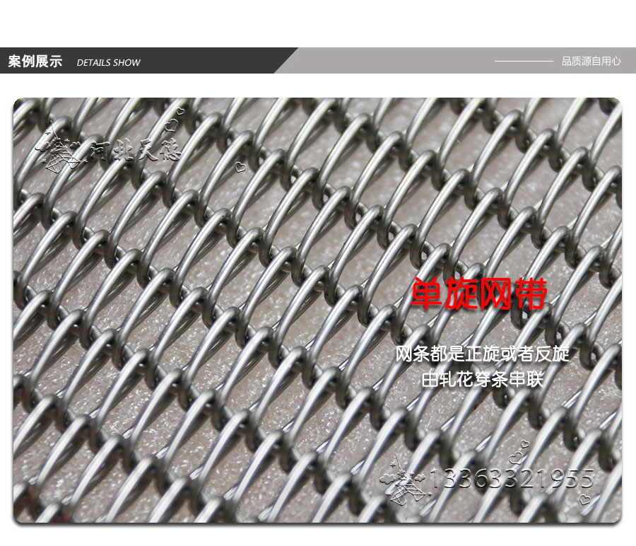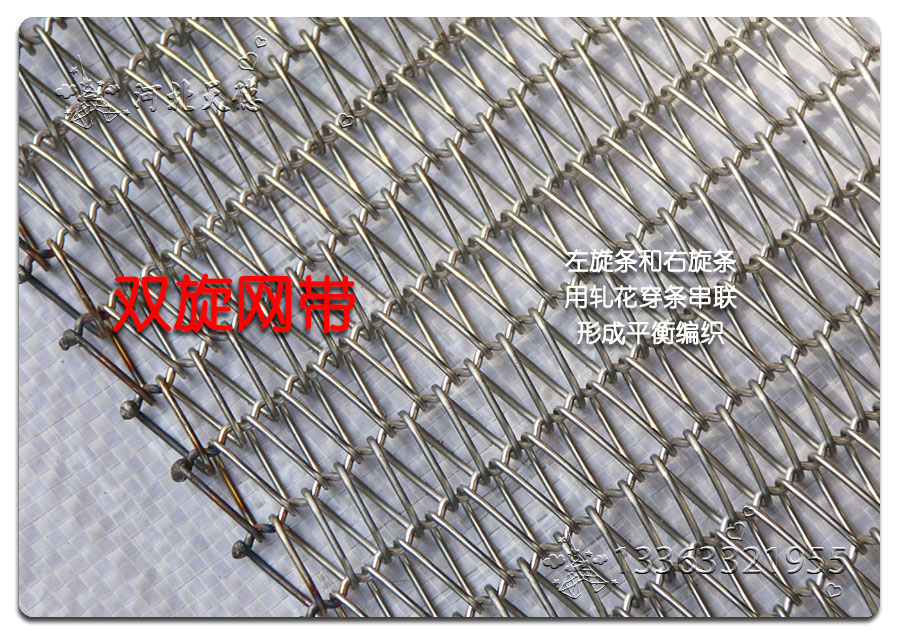 雙旋不銹鋼網(wǎng)帶屬于非標準件,我們將根據(jù)你提供的規(guī)格長寬,材質(zhì),不銹鋼絲線徑,編制結構尺寸,支軸直徑,支軸間距,鏈條型號等數(shù)據(jù)制作.