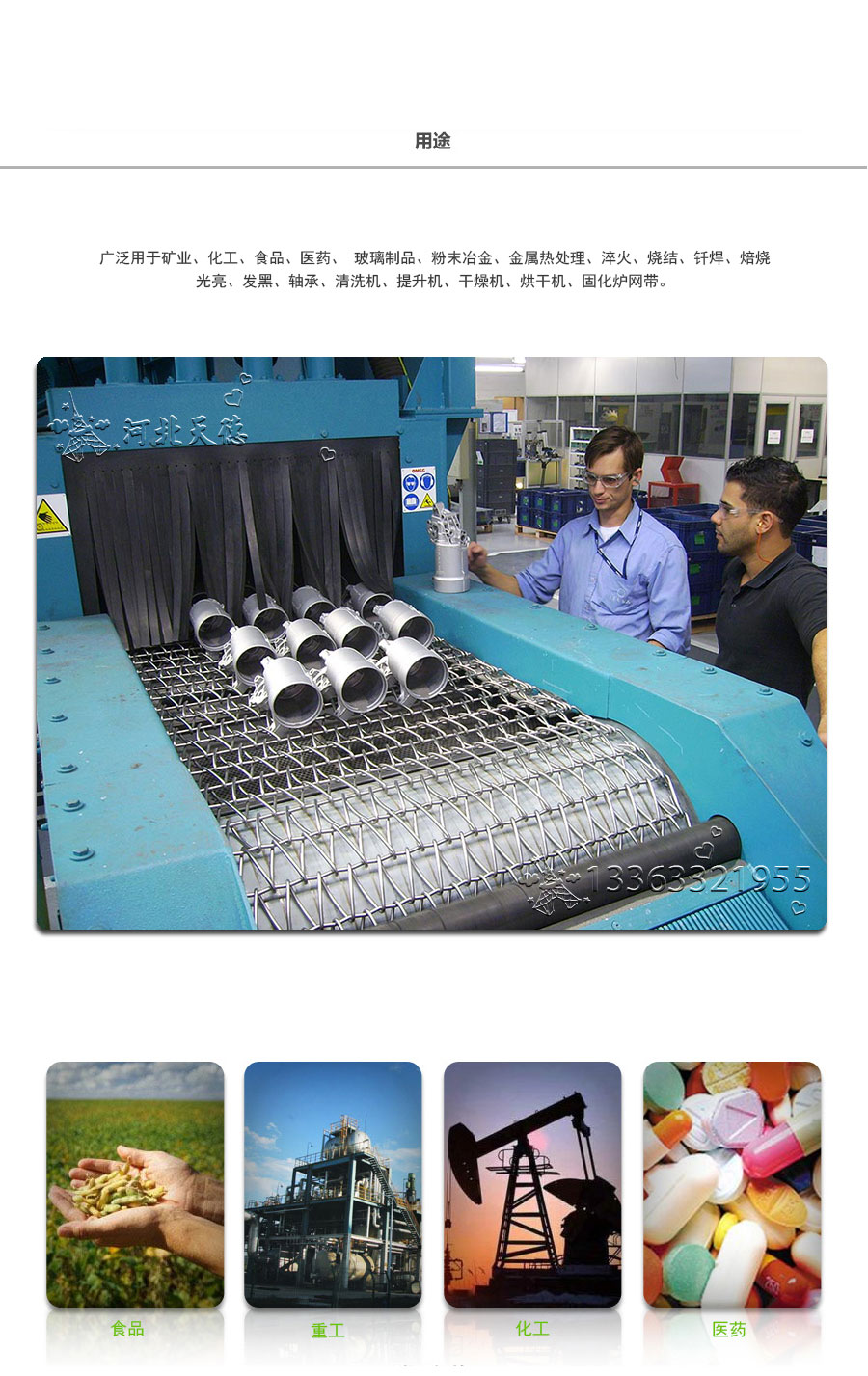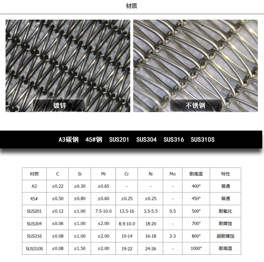 雙旋輸送帶:由左右交替的網(wǎng)條通過軋花串條聯(lián)結而成,集中了金屬絲編織網(wǎng)帶的各種優(yōu)點,由于具有彎曲較深的串條,使各個螺旋盤條的位置取得正確的定位,因此可以減少網(wǎng)帶的變型和延伸。 雙旋輸送帶材質(zhì):不銹鋼201、不銹鋼304、不銹鋼316、不銹鋼316L、普通鋼絲、普通鐵絲、耐高溫不銹鋼、耐酸不銹鋼 雙旋輸送帶用途:廣泛用于石油、冶金、食品加工機械、制藥、玻璃、印制線路板等輸送設備。