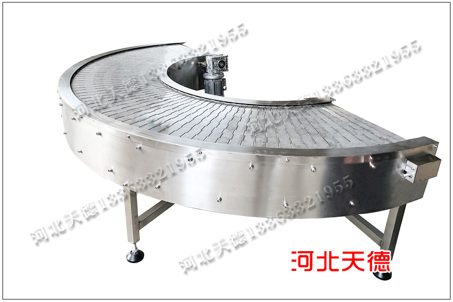 浙江金華市客戶定制的轉彎鏈板輸送機,轉彎角度為90度,采用2毫米厚的不銹鋼板轉彎加工,輸送機寬度為700毫米,高度為60公分,采用可調節機腿,上下能隨意調節將近10公分,客戶可以根據自己的需要來調節,輸送鏈板的寬度為 650毫米,鏈節距為38.1毫米,采用8毫米的串桿直徑。整臺機械用來輸送食品,因此采用別的材質不銹鋼304材質。
