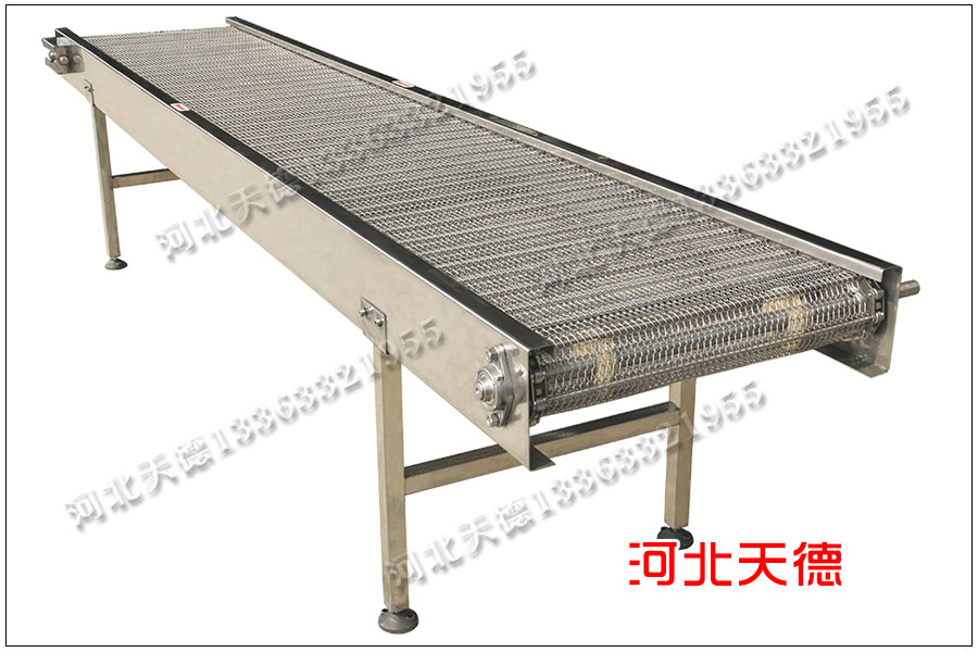 山西陽泉客戶定制的不銹鋼網帶輸送機,這臺輸送機用于高溫中使用,因此整機采用不銹鋼304材質,輸送機長度5米,總寬度650毫米,高度大概半米,采用1.5千瓦電機,配電減速機變頻器。